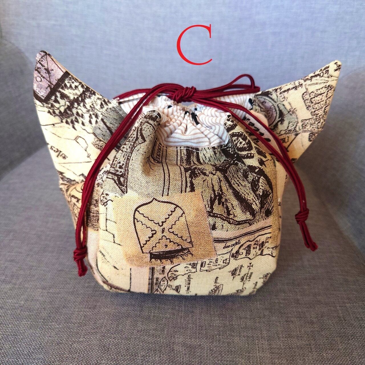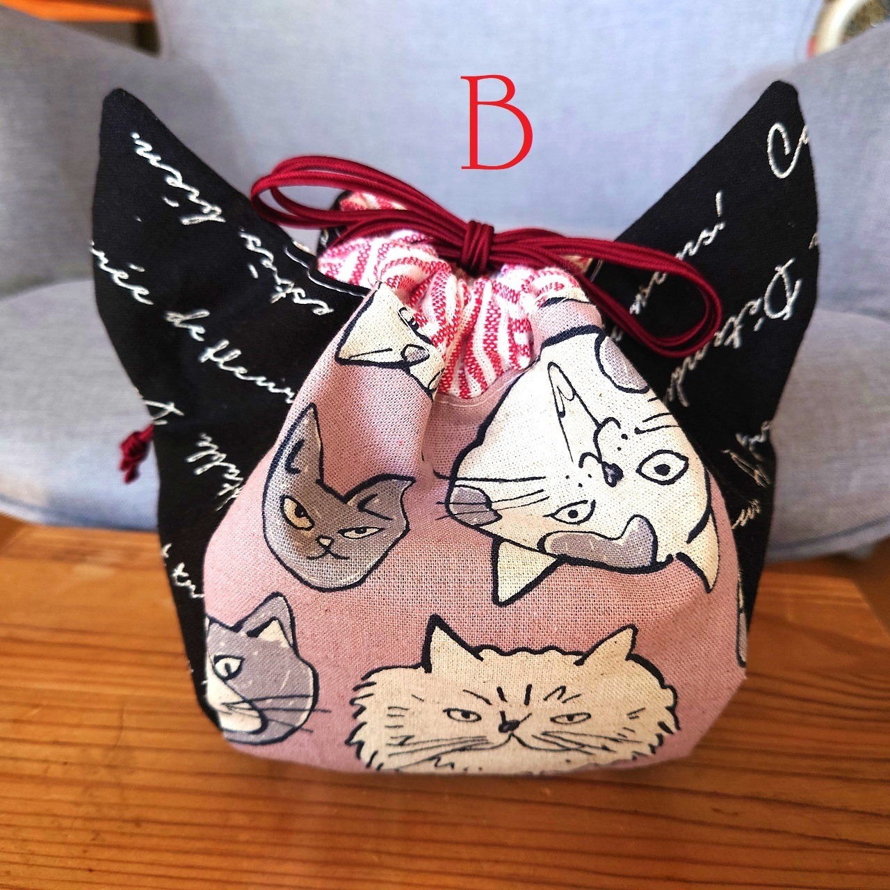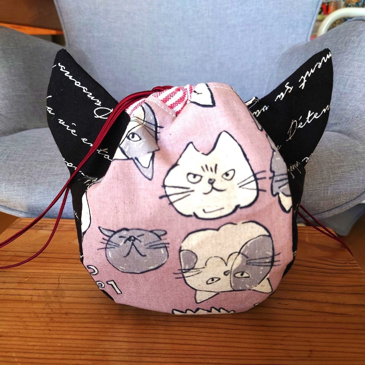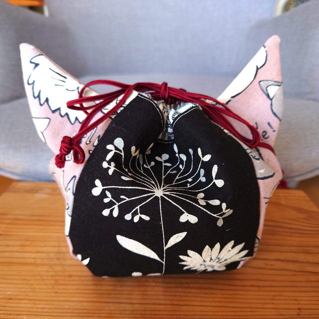 紐をぎゅっと絞ると、耳がピン立った猫の形になります。