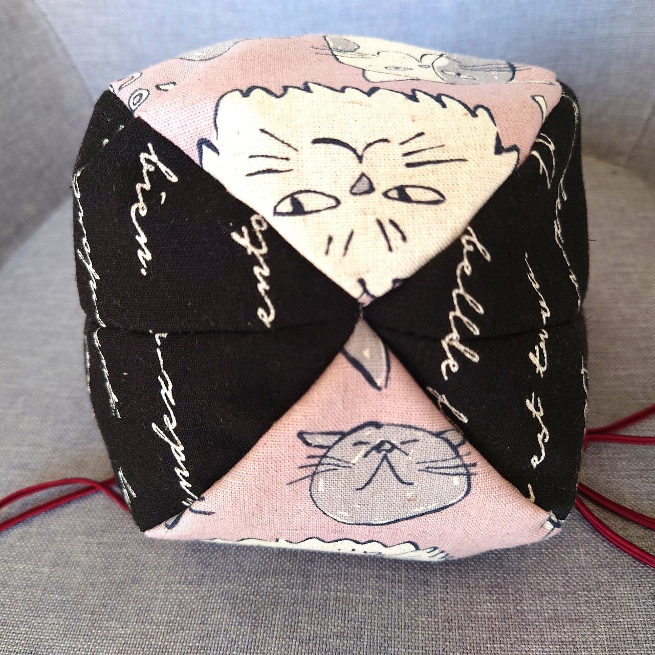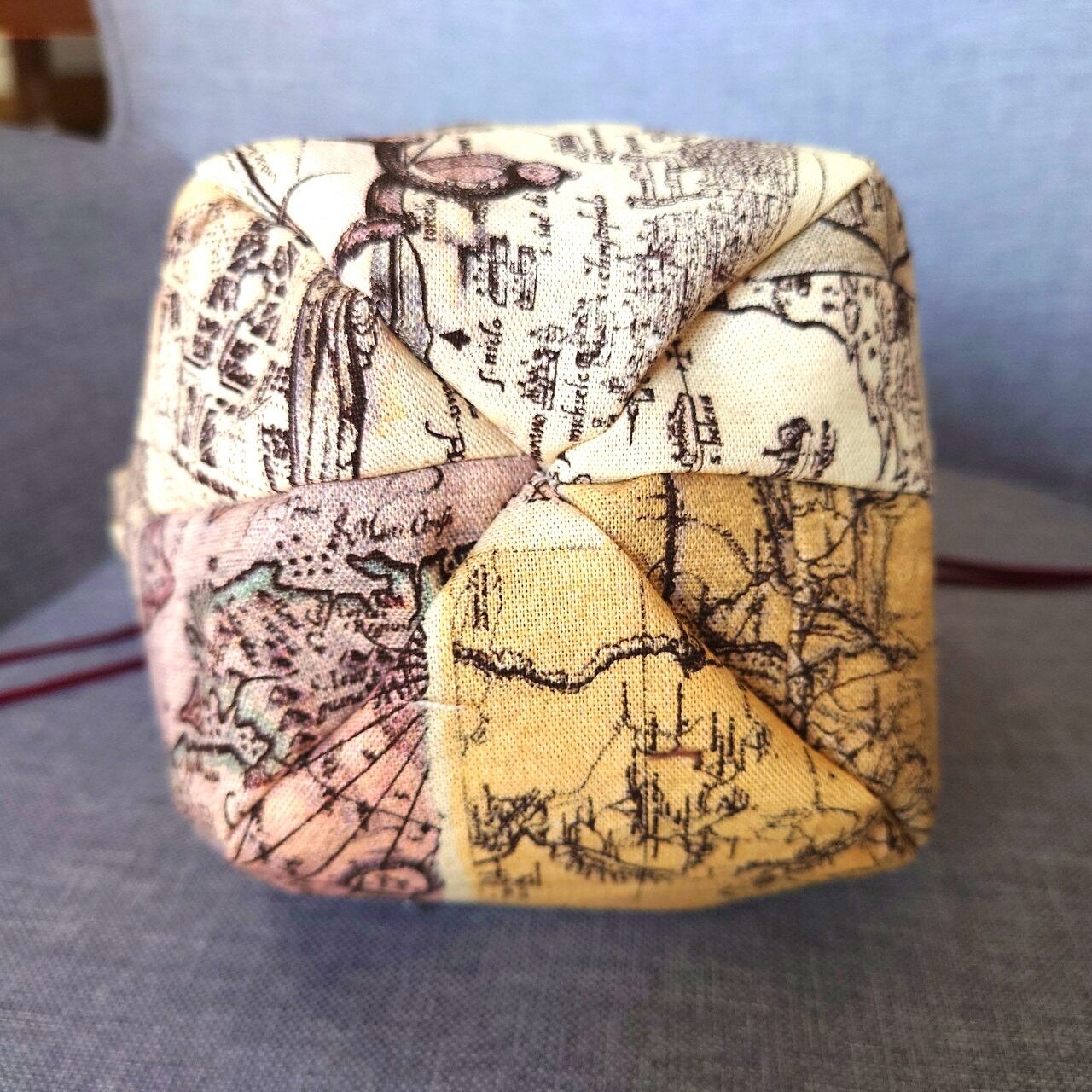 顔も耳も、アンティークな雰囲気の手書きの地図模様で、サビ猫ちゃん風の色味です。