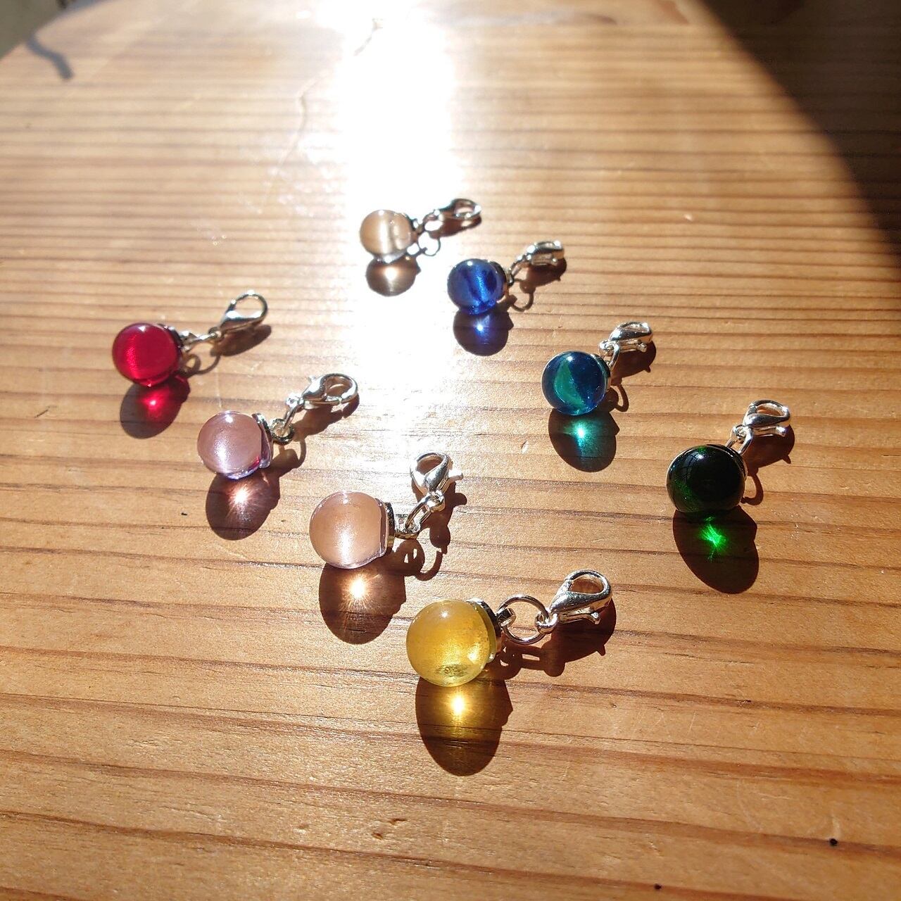 ガラス玉で作られたコロンと丸い球体のチャームつき。